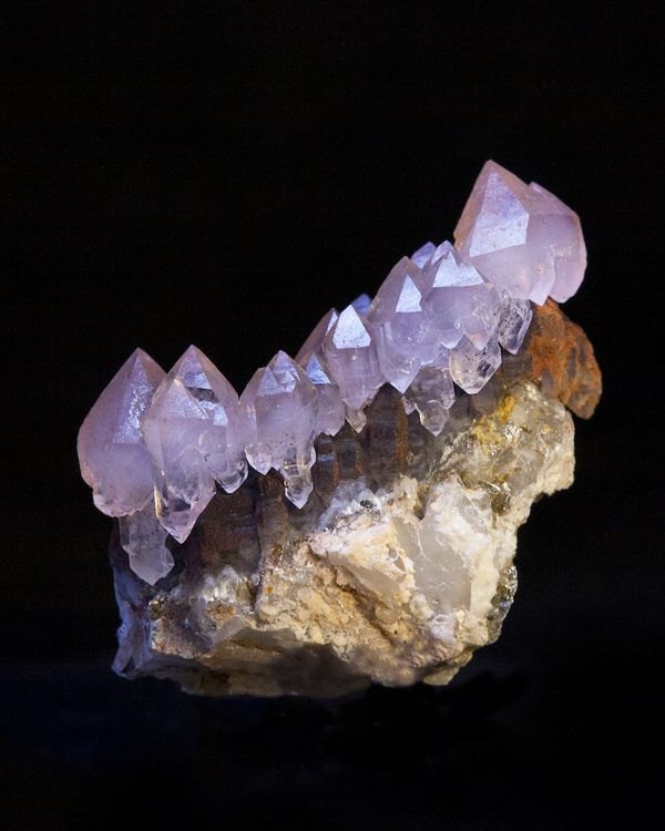 Most of the pieces from this zone were smoky or amethyst coated with hematite followed by a secondary crystal overgrowth. Several pieces had an orangish hue. Many were only on one face with the backside long ago etched or eaten away.